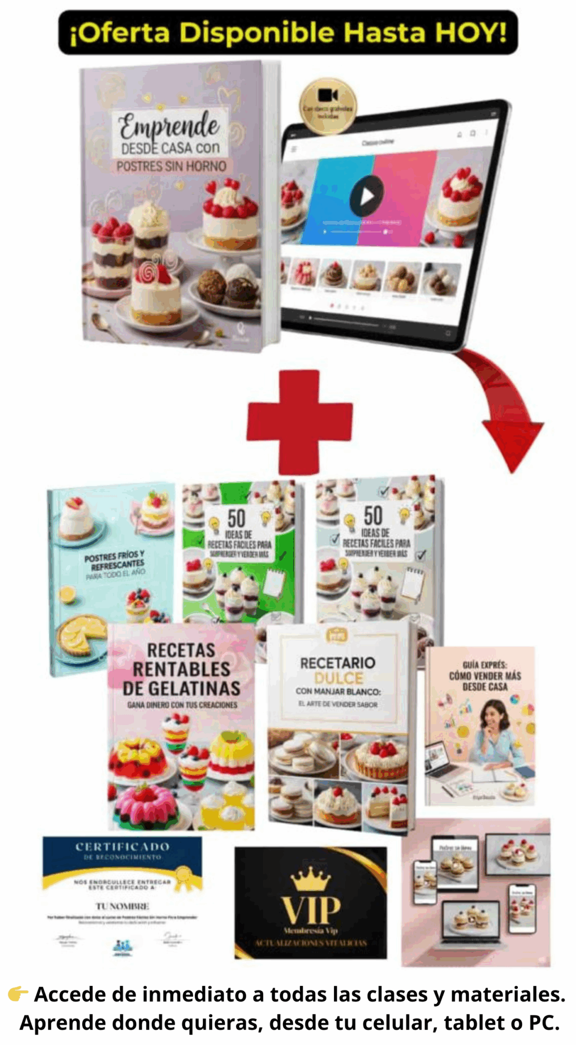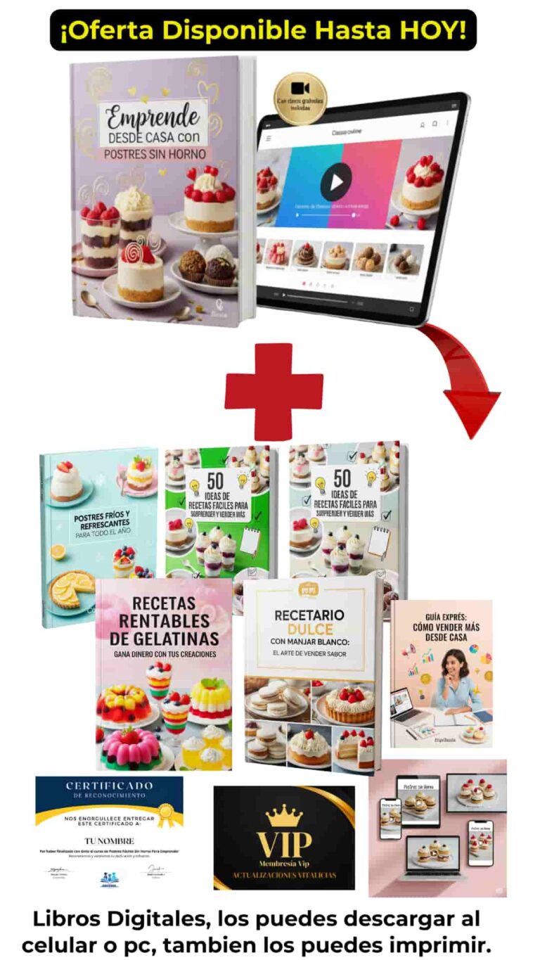 🔥 Solo por tiempo limitado, al acceder al Curso completo de Postres sin Horno, recibirás totalmente GRATIS los bonos premium que elevarán tus resultados y te ayudarán a vender más rápido.