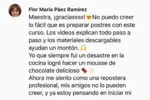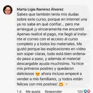 "Lo que más me sirvió fue el bono de costos. Antes regalaba mi trabajo y ahora sé exactamente cuánto gano por cada postre. ¡Excelente curso!"