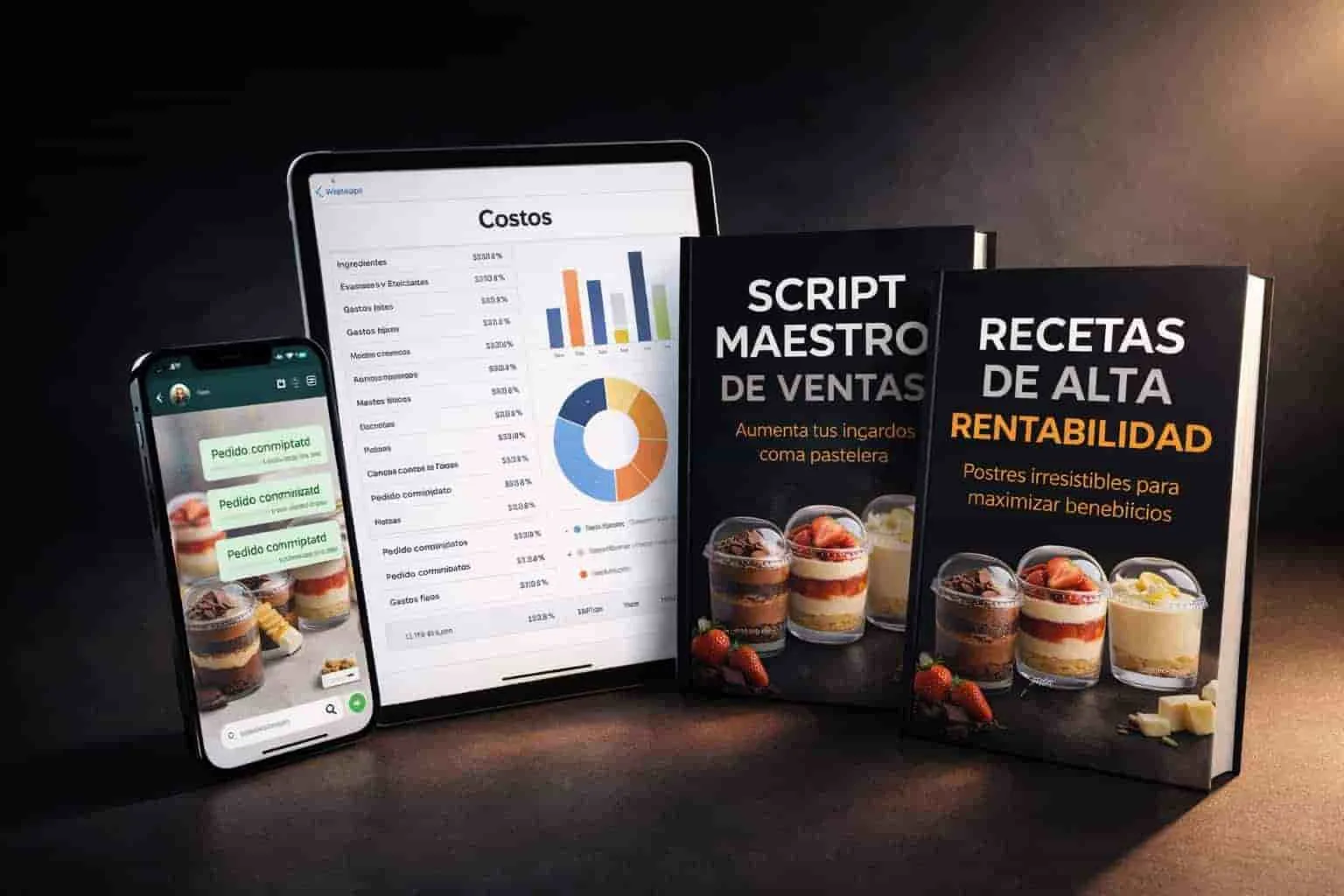 Desde las 50 recetas de alta rentabilidad hasta la Guía Maestra de Costos para cobrar correctamente por tus postres.